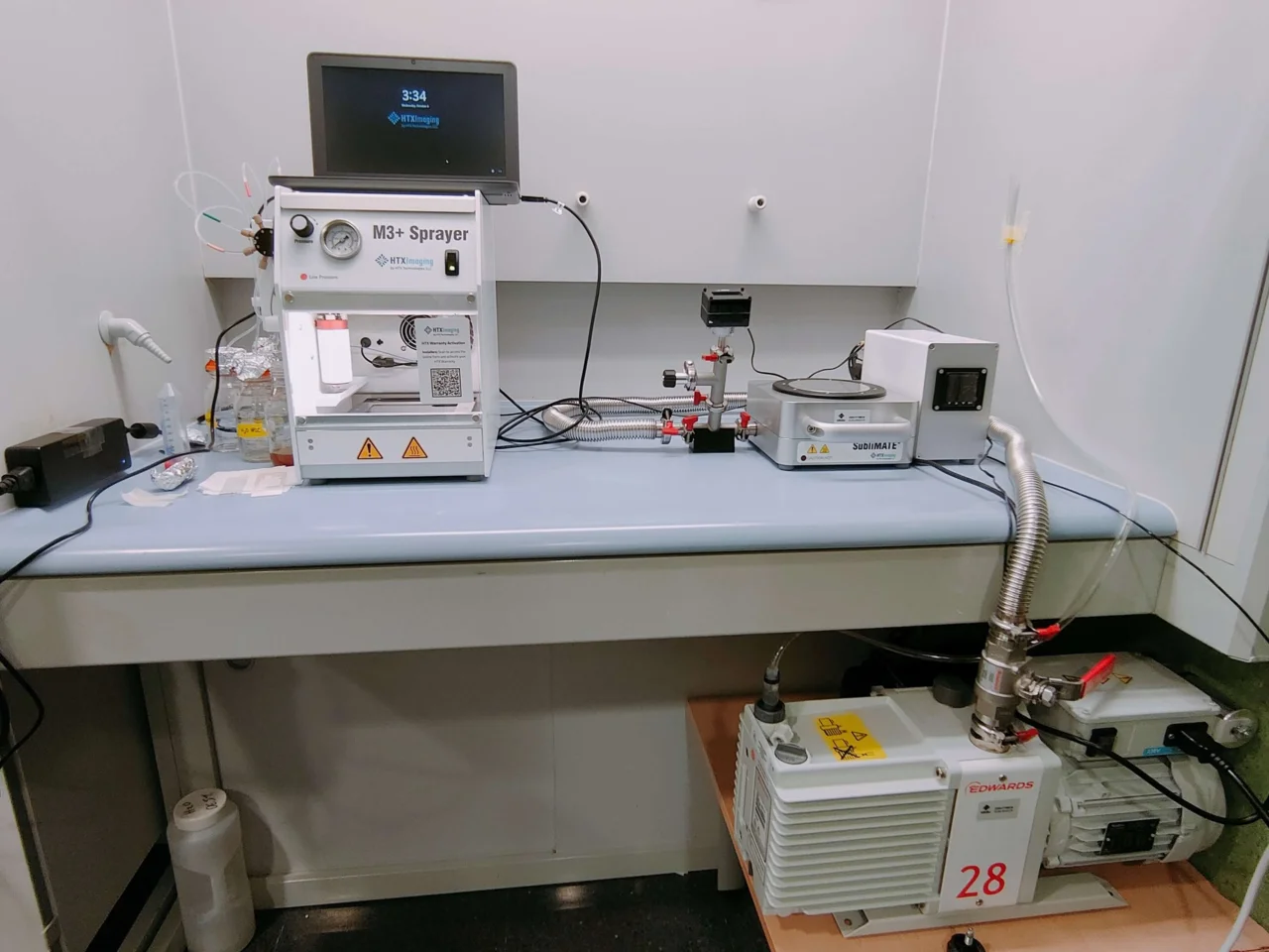- Complementariamente, el laboratorio está equipado con dispositivos especializados para técnicas de imagen molecular por espectrometría de masas (MSI), como lo Sprayer M3+ y el sistema SubliMATE (HTX Imaging Technologies). Estos equipos garantizan una preparación de muestras homogénea y controlada, aspectos esenciales para el análisis MSI, que también aseguran incrementar la calidad, la reproductibilidad y la fiabilidad de los resultados de los experimentos.